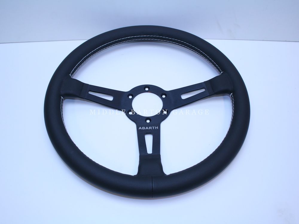 BLACK LEATHER, WHITE STICHING, SILVER ABARTH LETTERING.